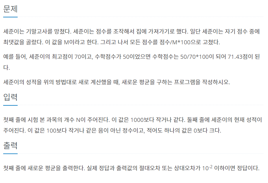 과목 개수를 입력받고 그 개수만큼 점수를 입력받아 문제에서 제시하는 새로운 평균식으로 결과를 출력한다.