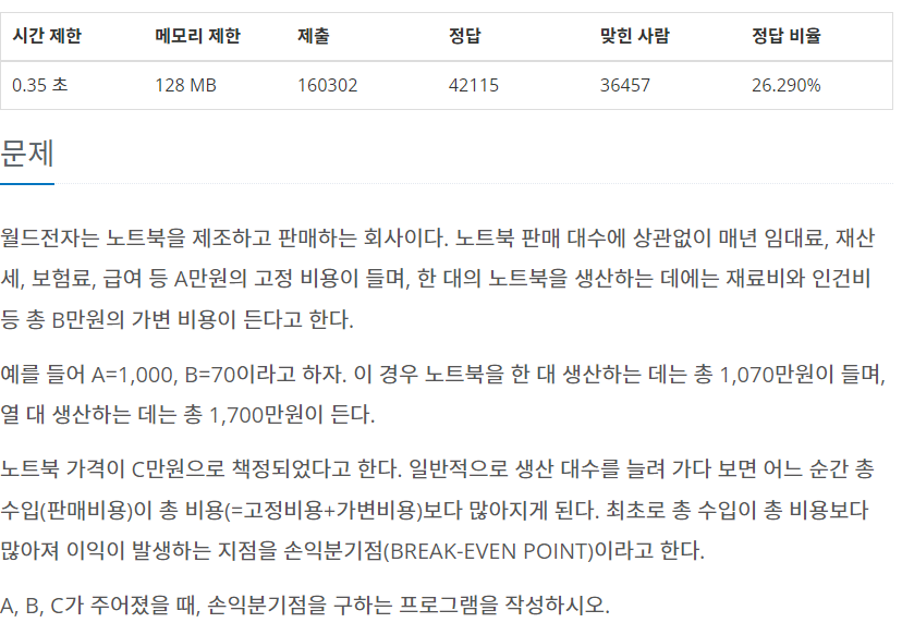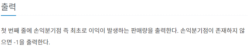 문제의 출력 조건을 보면 손익분기점이 존재하지 않는 경우에는 -1을 출력하라고 한다. a+b*n<c*n 의 식이 절대 불가한 경우에 -1을 출력하는 것이라고 보면 된다. 위 식에서 b가 c보다 크거나 같은 경우 n의 크기가 아무리 커져도 b*n<c*n이 불가능하다는 것이 중요하다.
