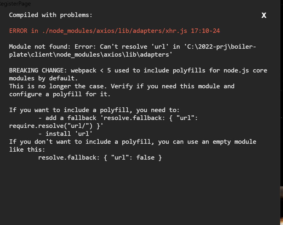 [Webpack] BREAKING CHANGE: webpack < 5 used to include polyfills for node.js core modules by default