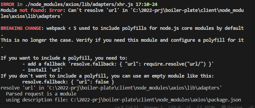 React를 BREAKING CHANGE: webpack < 5 used to include polyfills for node.js core modules by default error가 발생할 수 있다. webpack 버전이 5 이상이 되면서 더이상 지원하지 않는 것이기 때문에 webpack..